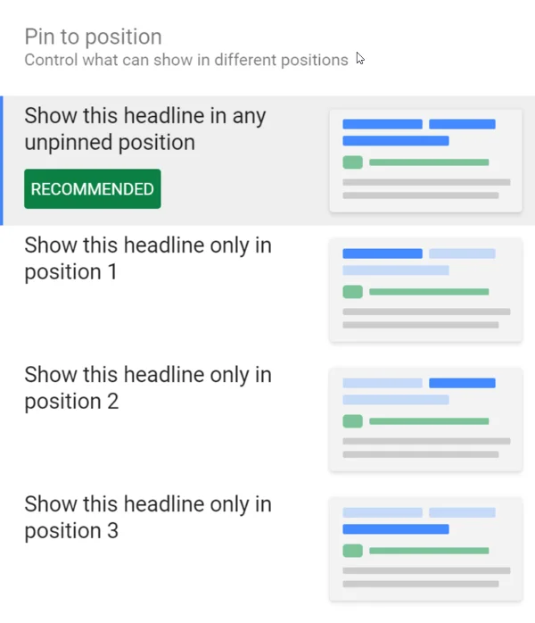 Responsive Search Ads also give you options to pin certain headlines and descriptions to specific positions, effectively allowing you to combine the adaptability of RSAs with the creative control of ETAs in any proportion you deem fit. For example, by pinning several headlines to one position, you will be forcing them to rotate between each other depending on the algorithm’s choice. This way, you can choose exactly which headlines and descriptions will be shown in which positions and prevent your ad from showing text that might not make a lot of sense.