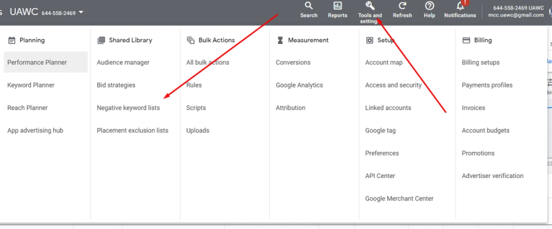The best tool to use for this woud be Search Terms report in Google ads. To access it, select one of your search campaigns under the Campaigns tab, then click on Search Terms Report and open the Negative keywords tab. Here, you should be able to see the queries your ads were eligible for. If you see a query that is unrelated to the products or services you provide, you’ve just found a perfect negative keyword candidate.