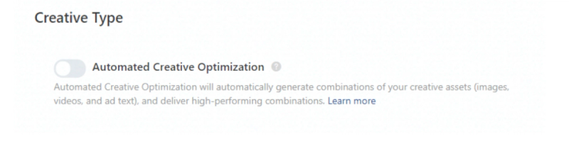 Another interesting TikTok Ads feature is Creative Optimization. When Automated Creative Optimization is enabled, your ads will be created by automatically choosing the ideal combination of your creative assets (images, videos, and ad texts).