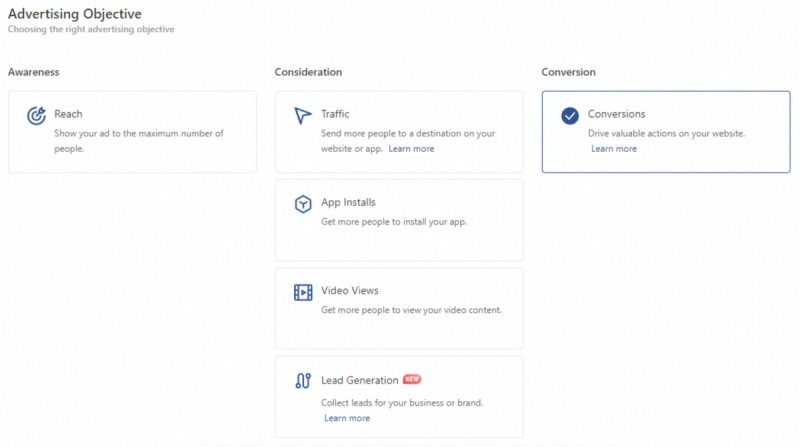 According to your business objective, you can choose from three options: awareness (make people aware of your business), consideration (drive traffic to your website, send people to App Store or PlayMarket to click on your app and download it) and conversion (get people to buy or use your products).