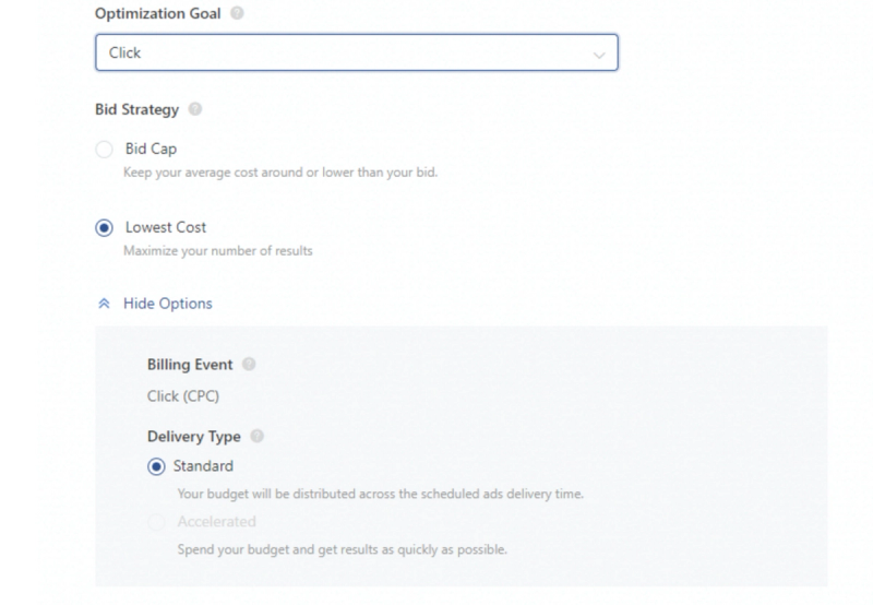 The first option here is the optimization goal. There are three types – conversion, click and reach. Depending on the objective of optimization, there are three types of bid strategies: Bid Cap, Cost Cap, and Lowest Cost Bid.