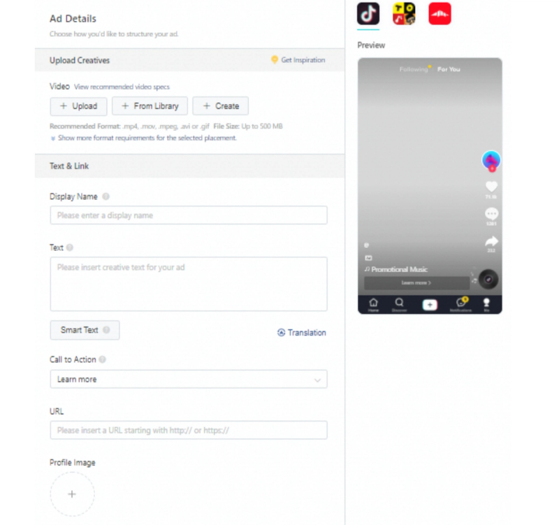 Further action is to set up text assets. In the Display Name bar, you should type the text that is consistent with the brand, product, or company name of the website or app being promoted. Text at the Text bar is displayed to your audience as part of your ad creative and will help them understand what you’re promoting. TikTok advertisers can also use the Smart Text option. Your ad text will be automatically generated based on the industry, language, and keywords you choose. There is also a translator available in more than 50 languages.