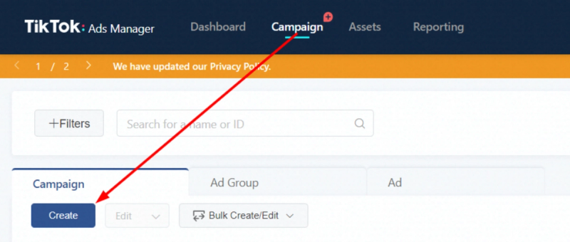 When it comes to the TikTok advertising platform overview, we have the following structure of the TikTok Ads manager: Dashboard, Campaign, Assets, and Reporting.