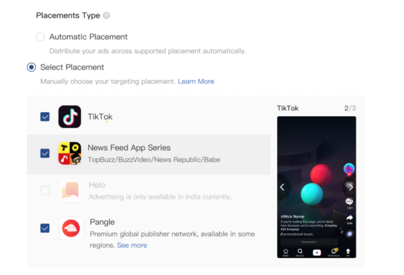 Here you are able to choose where you want your ads to appear. When you select Automatic Placements, the system will optimize your ad delivery across all placements so it reaches more people and drives more traffic.