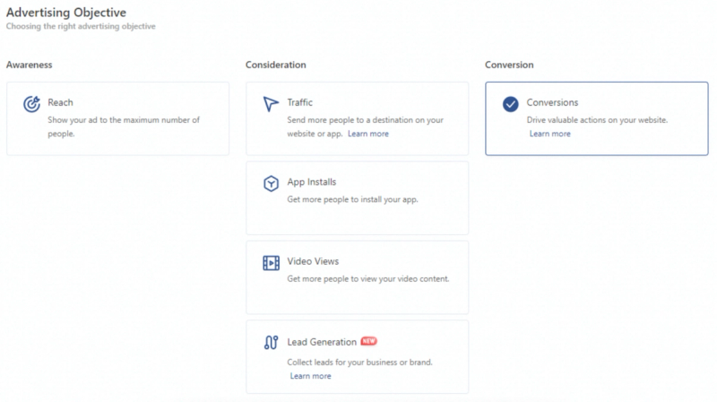 According to your business objective, you can choose from three options: awareness (make people aware of your business), consideration (drive traffic to your website, send people to App Store or PlayMarket to click on your app and download it) and conversion (get people to buy or use your products).