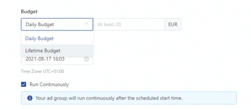 The budget can be set for campaigns as well as ad groups (a campaign can consist of several ad groups). Budgets can be divided into two types: lifetime budgets and daily budgets.